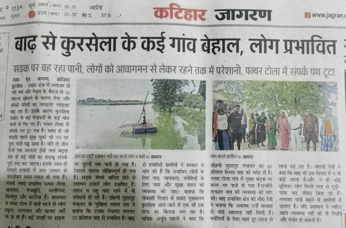 Heavy floods caused by the rising waters of the Ganga and Kosi rivers have severely affected villages like Pathar Tola, Badhmara, and Teengharia in Katihar district. Roads to the main town are cut off, schools and hospitals are inaccessible, and thousands are struggling for basic necessities. Families are stranded, farmlands are submerged, and many have been forced to take shelter on high roads and embankments.